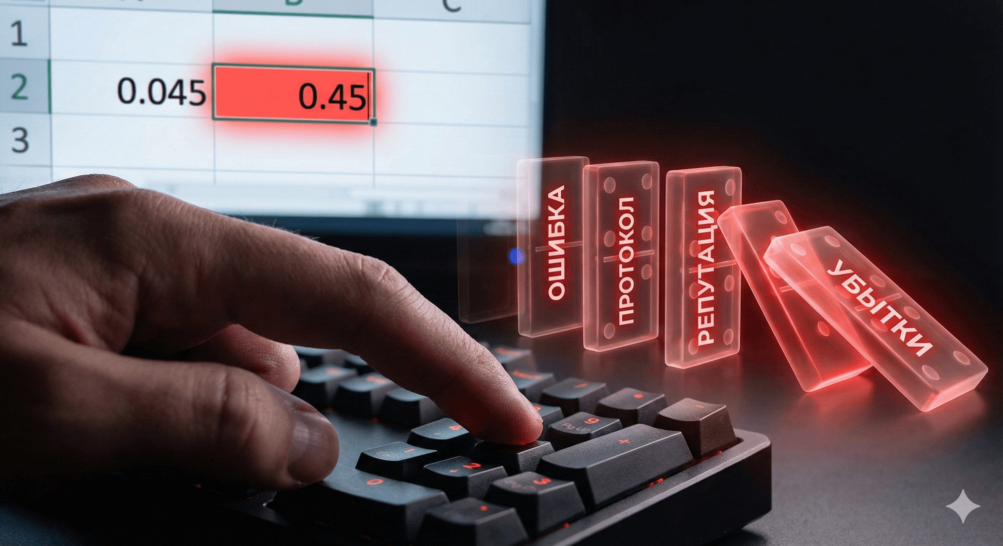 Лаборант провел сложный анализ и получил результат 0,045. Но при переносе данных в Excel рука дрогнула, и в ячейку попало 0,45. Excel безропотно принял эту цифру. Результат ушел в протокол, протокол — заказчику. Последствия могут быть катастрофическими — от забракованной партии продукции до несоответствий и приостановки аттестата аккредитации при проверке.